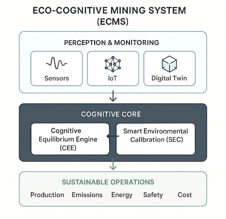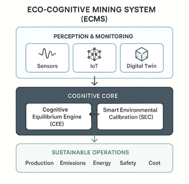 The mining industry faces growing pressure to meet global resource demands while adhering to strict environmental, social, and governance (ESG) standards. Existing frameworks in Mining 4.0 largely focus on digital transformation but lack environmental self-awareness and adaptive sustainability control. This study introduces the Eco-Cognitive Mining System (ECMS), a novel paradigm that integrates Cognitive Equilibrium and Smart Environmental Calibration (SEC) within a unified cognitive control architecture. ECMS allows mines to perceive environmental changes, reinterpret operational objectives, and autonomously adapt across the production lifecycle. A quantitative simulation comparing ECMS against a baseline fixed-control system demonstrates substantial improvements: an 85% reduction in emission violations, improved safety stability, and lower operational costs. The results validate ECMS as a foundational framework for Mining 5.0, where intelligent autonomy and sustainability coalesce to form self-aware, adaptive, and ecologically balanced mining ecosystems.